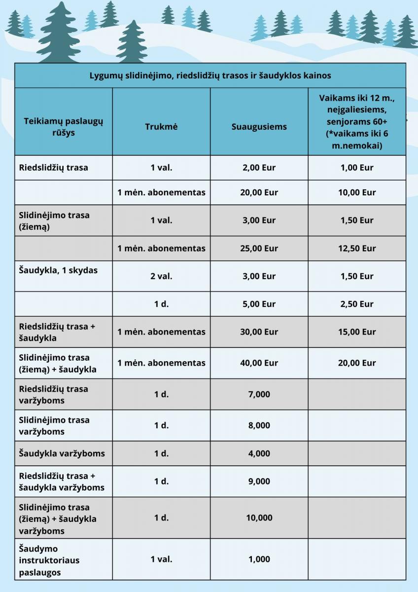 Das Bildungs- und Sportzentrum des Bezirks Ignalina informiert Sie darüber, dass Sie die Gebühren für unsere Dienstleistungen auf das Swedbank-Girokonto LT957300010190442423 überweisen können. Bitte geben Sie im Verwendungszweck „Skiing Trails“ an. Alternativ können Sie die Zahlung auch an der Kasse des Wettkampfzentrums (Montag bis Freitag von 13:00 bis 21:00 Uhr) vornehmen. Die Preise finden Sie hier: https://irsspc.lt/.../Ziemos-sporto-centras.-Paslaugos.pdf