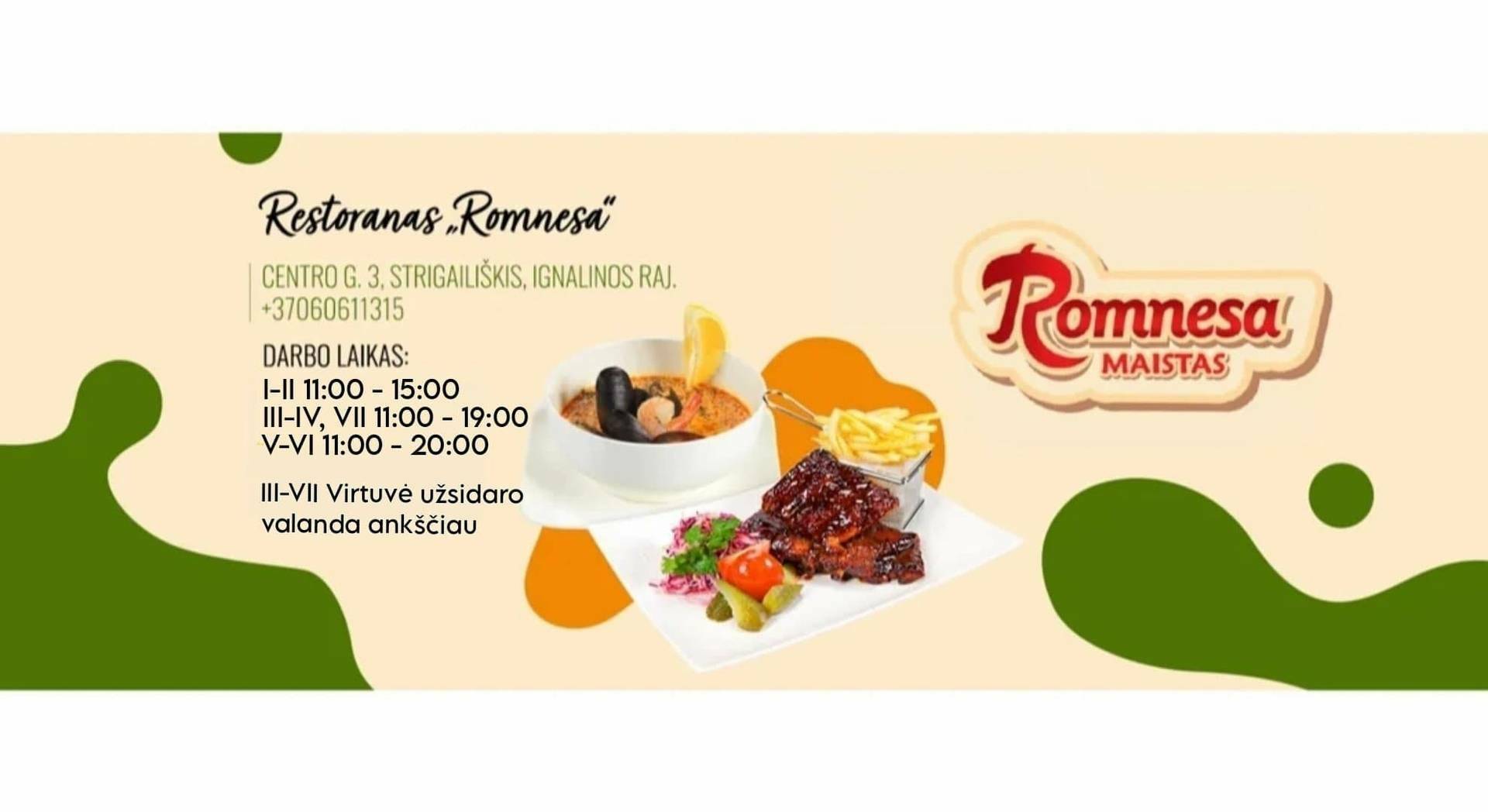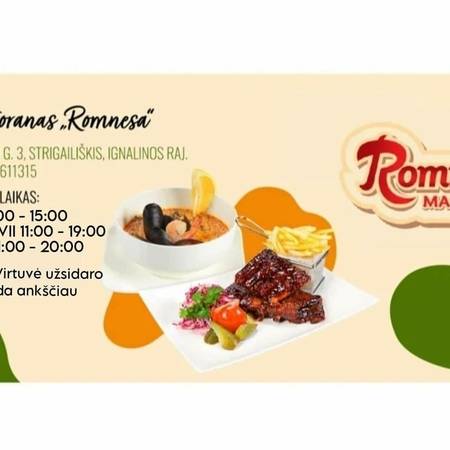 At the “Romnesa” restaurant-bakery, we are waiting for you with your family, friends, and colleagues. In a cozy environment, you can choose from the restaurant menu and enjoy dishes prepared over an open fire and meals made from Lithuanian natural products.