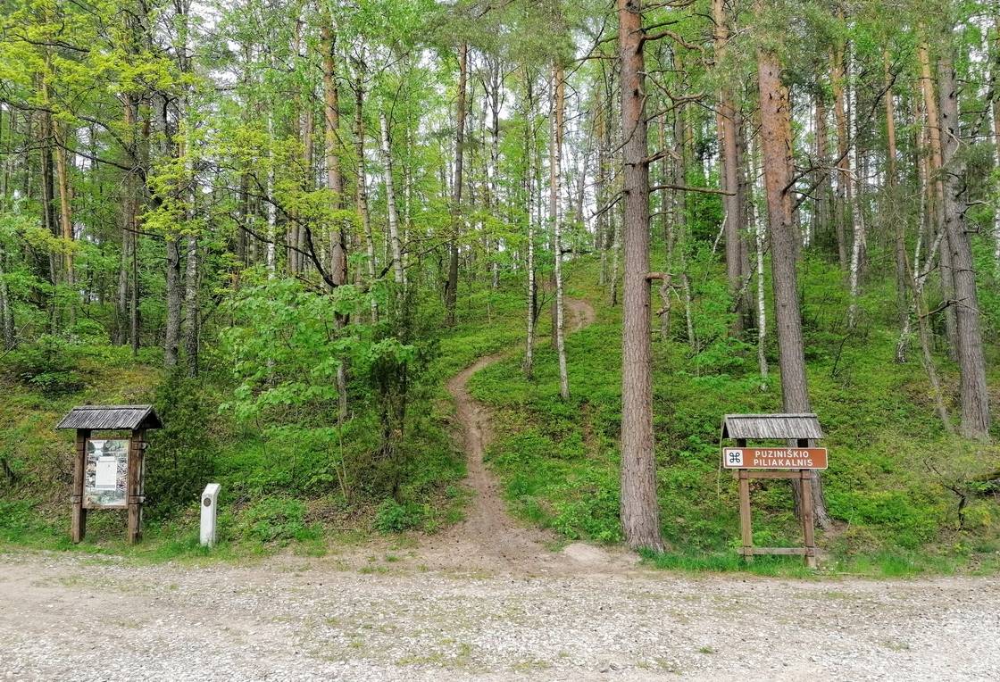 Start of the route at Ginučiai water mill. From the car park, turn left and follow the main road south for about 450 m. On the second road, turn left from the bus stop. The path immediately branches into two smaller ones. Keep right. Follow this road for 2.2 km. On the right side of the road, passing the bog of the lake of Asėkas for 500 m. you will reach a four-way intersection. Keep it right. Follow the forest road for 700 m. and turn right at a sharp angle into the branch road. Travel it in a westerly direction for about 500 m. and you will exit the main road again. Keep right. The road bypasses the Puziniškis mound from the right. After 100 m. you will pass the homestead on the right, and another 150 m. you will reach the bridge and the resting place of Puziniškis mound. After crossing the bridge, keep left, go along the lake to the southeast. After 400 m. the road makes a sharp bend and climbs a mountain. Another 400 m. you will reach the village of Islands. At it you will reach a triple junction, step towards the village of Islands II. It is about 1 km away. At the beginning of the village of Islands II, after passing the clone standing on the right, turn right. Take the field road to the forest and through it to the T-junction. In it, turn left. Travel along the shores of Lake Linkmenas to the canal connecting Alksnaitis and Linkmenas lakes. a bridge for pedestrians and cyclists was built through the canal. There is a pedestrian and bicycle path from the channel to the top of Ladakalnis. When you reach the first fork, turn left and the second fork to the right. The rise is steep. The same gravel path leads from Ladakalnis to Ginučiai mound. It starts to the left of the wooden observation platform and winds through the wilderness to the road Kimbariškė - Ginučiai. After crossing the asphalt road, continue along the gravel path towards Ginučiai mound. After going down the stairs, turn left and walk along the hillside through the car park. At the end of it, a small outdoor path begins. Walk it for about 300 m until you reach the next road. Turn right and drive another 0.5 km until you reach an asphalt road. Turn left and 0.5 km. you will reach the Šiliniškės observation tower. From the tower, return to Ginučiai village. Go through the village on the main street to the watermill from which you started your hike.