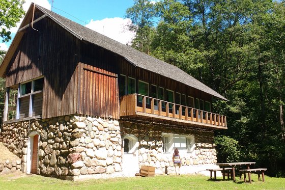 Ginučiai - Kirdeikiai - Stripeikiai. After looking around, go back along the same road to the last crossroad, and go straight at the crossroad. After going another 1.2 km, you will see a resting place on the right side of the road and Šiliniškis Observation Tower. From the tower, continue along the asphalted road until you reach a three-way crossroad. Take the right turn at the crossroad. After 400 m, you will see another crossroad. Keep to the main road and turn right again, towards the village of Kirdeikiai. In this village, there is a church you can look over. Outside the town, you will see a sign directing to the Museum of Ancient Beekeeping. Turn right. Go along the gravel road in a northern direction. After entering the forest, you will see a forest road branching off to the right after 150 m, it will take you to Pakasas Watermill. After seeing around the watermill, go back to the main road. Turn right, and go towards Stripeikiai village.