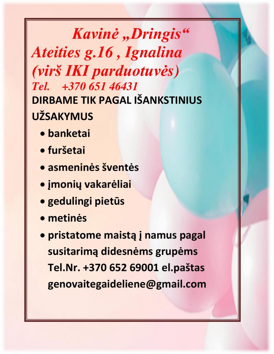 Kavinė „Dringis“ Ateities g. 16 , Ignalina (virš IKI parduotuvės) Tel. +370 651 46431