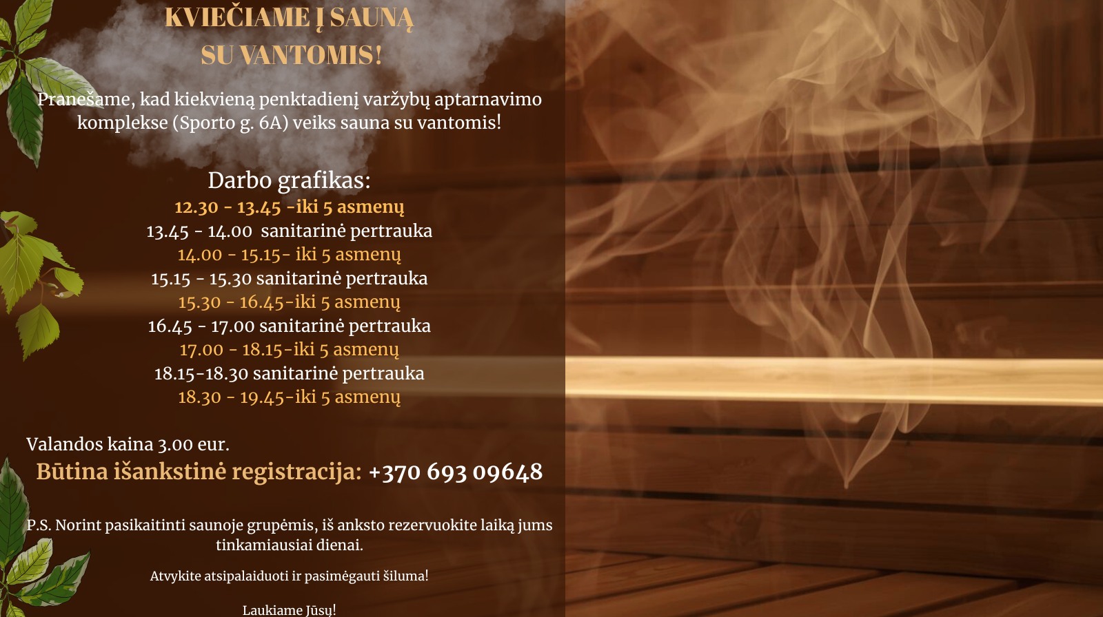 Taip pat yra galimybė sauną rezervuoti grupėms jums patogiausią dieną – kviečiame susisiekti iš anksto.
