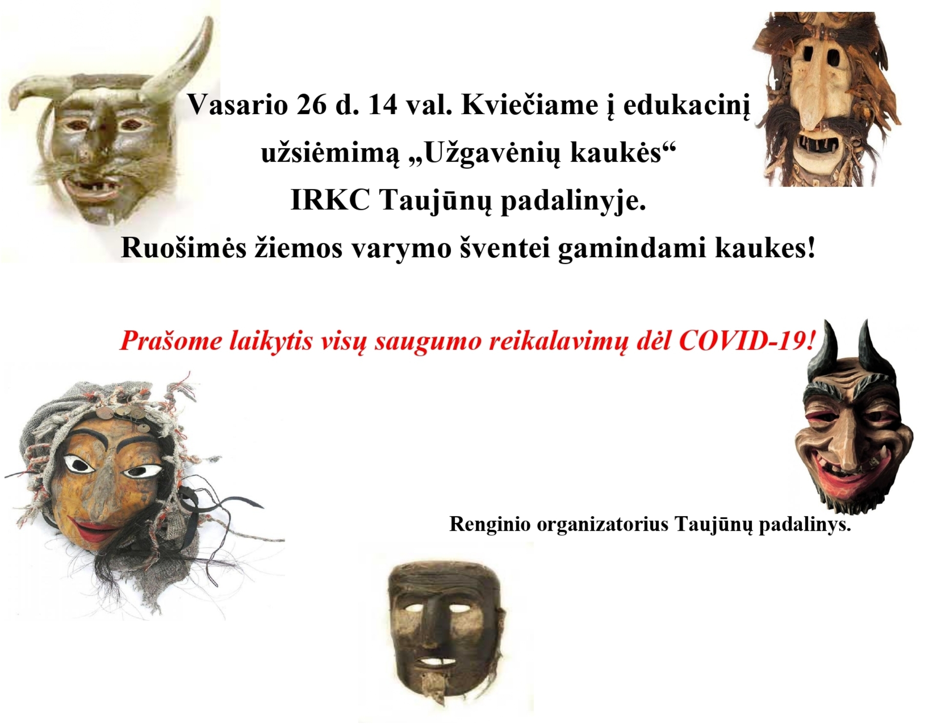 Užsiėmimo metu dalyviai praktiškai ir teoriškai susipažins su Užgavėnių šventės papročiais, tradicijomis, personažais. Praktinio užsiėmimo metu kiekvienas dalyvis gamins pasirinktus personažus. Užgavėnių