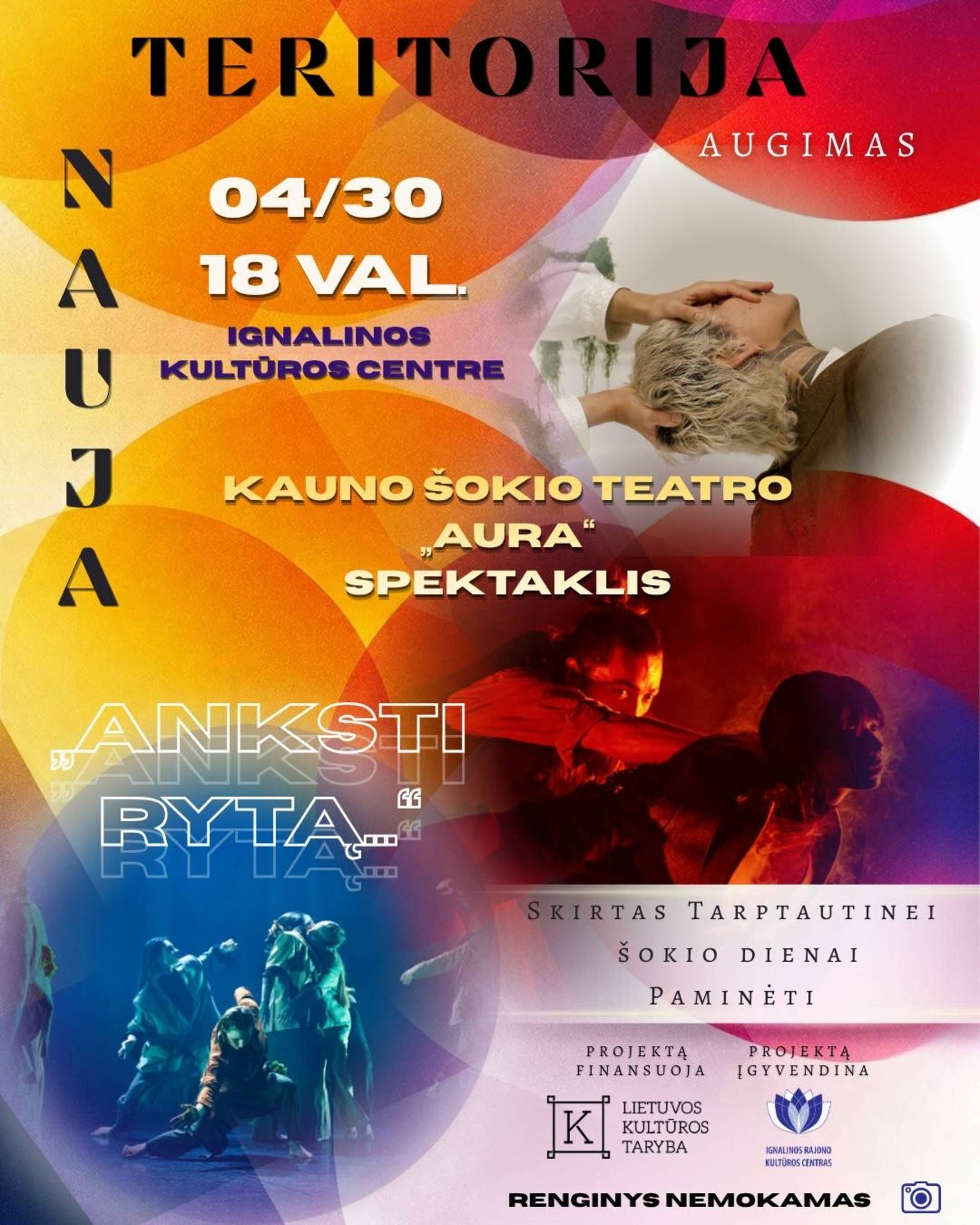 Balandžio 30 d. 18 val. kviečiame į pirmąjį projekto NAUJA TERITORIJA. AUGIMAS renginį – Kauno šokio teatro „Aura“ spektaklį „Anksti rytą...“ Ignalinos kultūros centre.