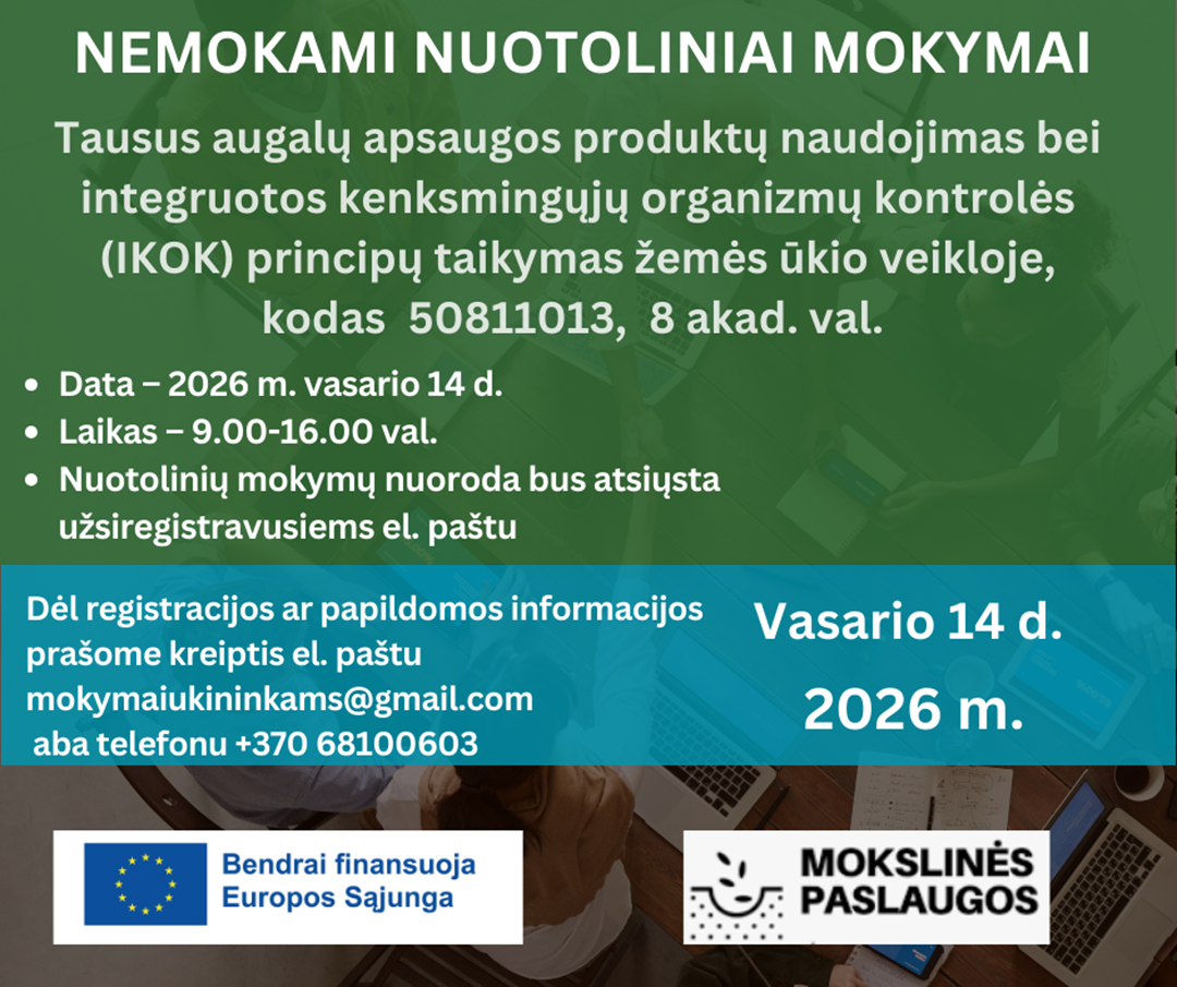 ✅ Seminaro tema „Tausus augalų apsaugos produktų naudojimas bei integruotos kenksmingųjų organizmų kontrolės (IKOK) principų taikymas žemės ūkio veikloje“