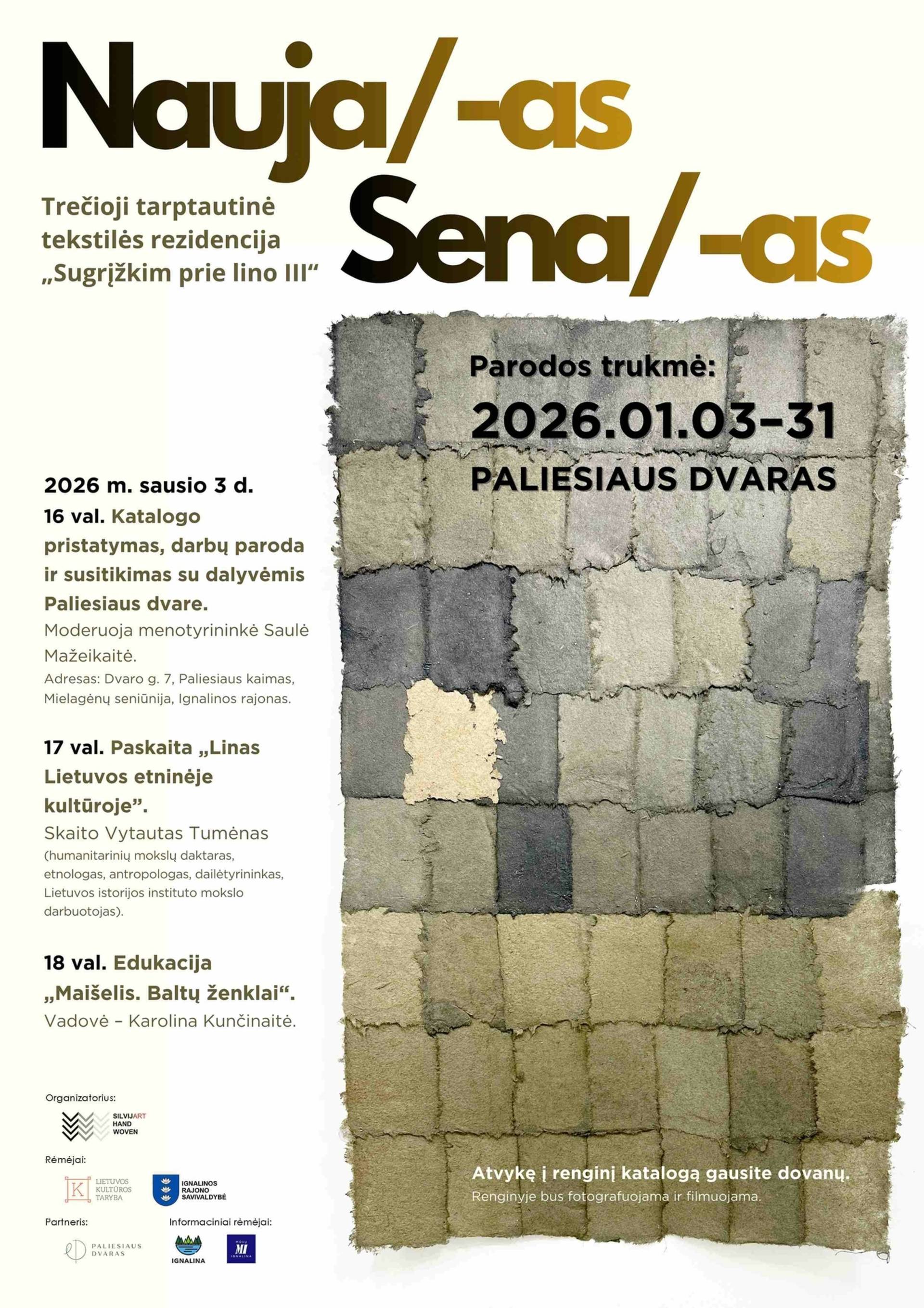 Sausio 3 d. Paliesiaus dvare (Ignalinos r.) kviečiame į trečiosios tarptautinės tekstilės rezidencijos „Sugrįžkim prie lino“ katalogo „Sena/-as Nauja/-as“ pristatymą. Renginio metu atidaroma tekstilės darbų paroda, vyks paskaita, edukacinė veikla, o erdvę užpildys klasikinės muzikos garsai.