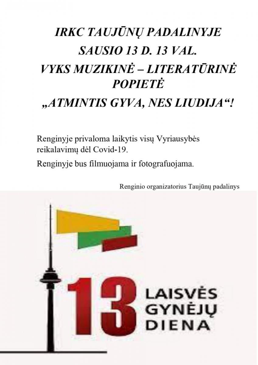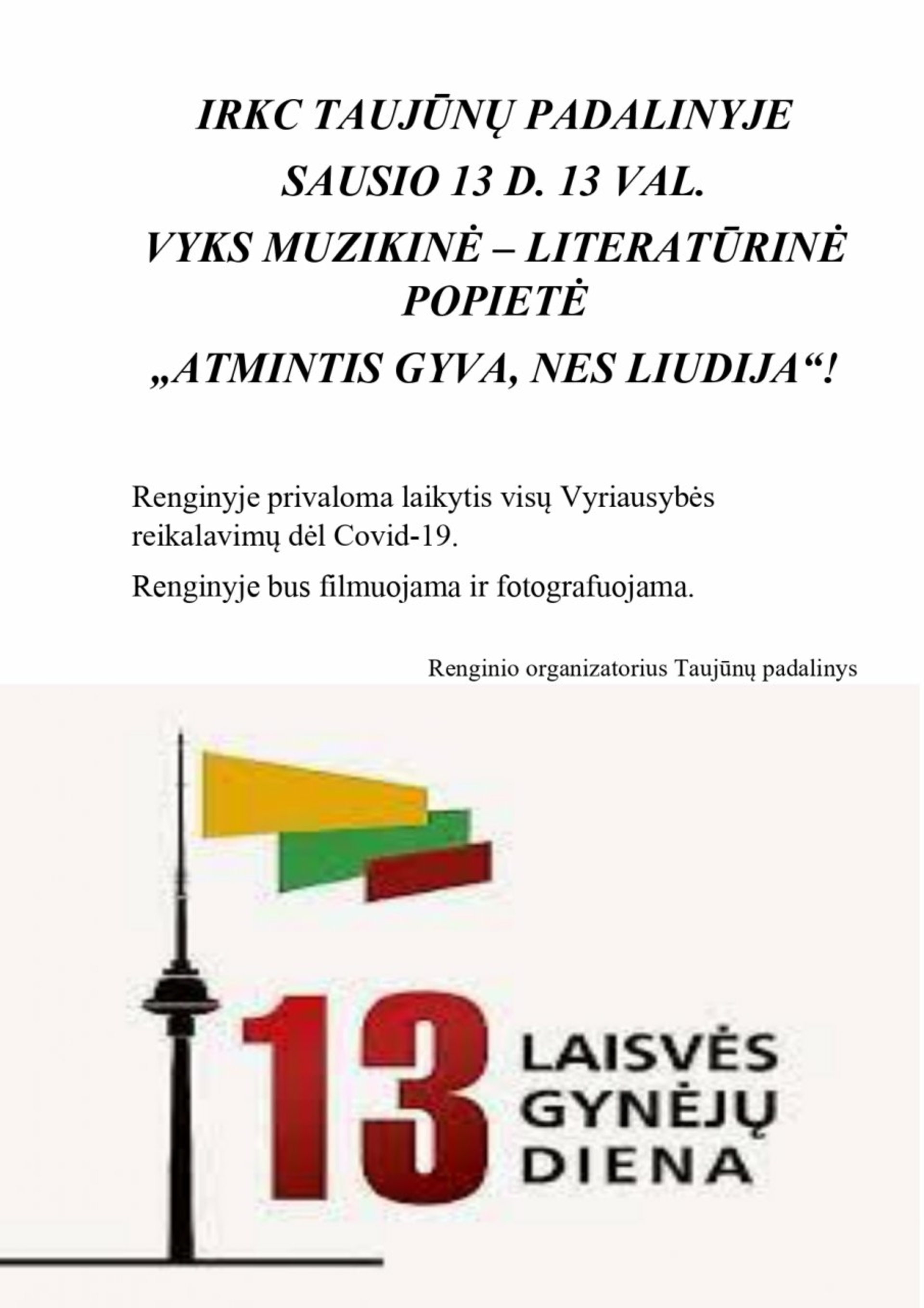 Minėjimo metu bus prisiminti įvykiai, kurie leidžia mums šiandien gėrėtis laisve. Pradžioje tylos minute pagerbsime kurie žuvo už laisvę.Renginio metu skaitysime eiles, skambės kolektyvo ,, Radasta '' patriotinės dainos. 8 val. jungsimės prie pilietinės iniaciatyvos, u-deksime languose atminimo žvakutes.