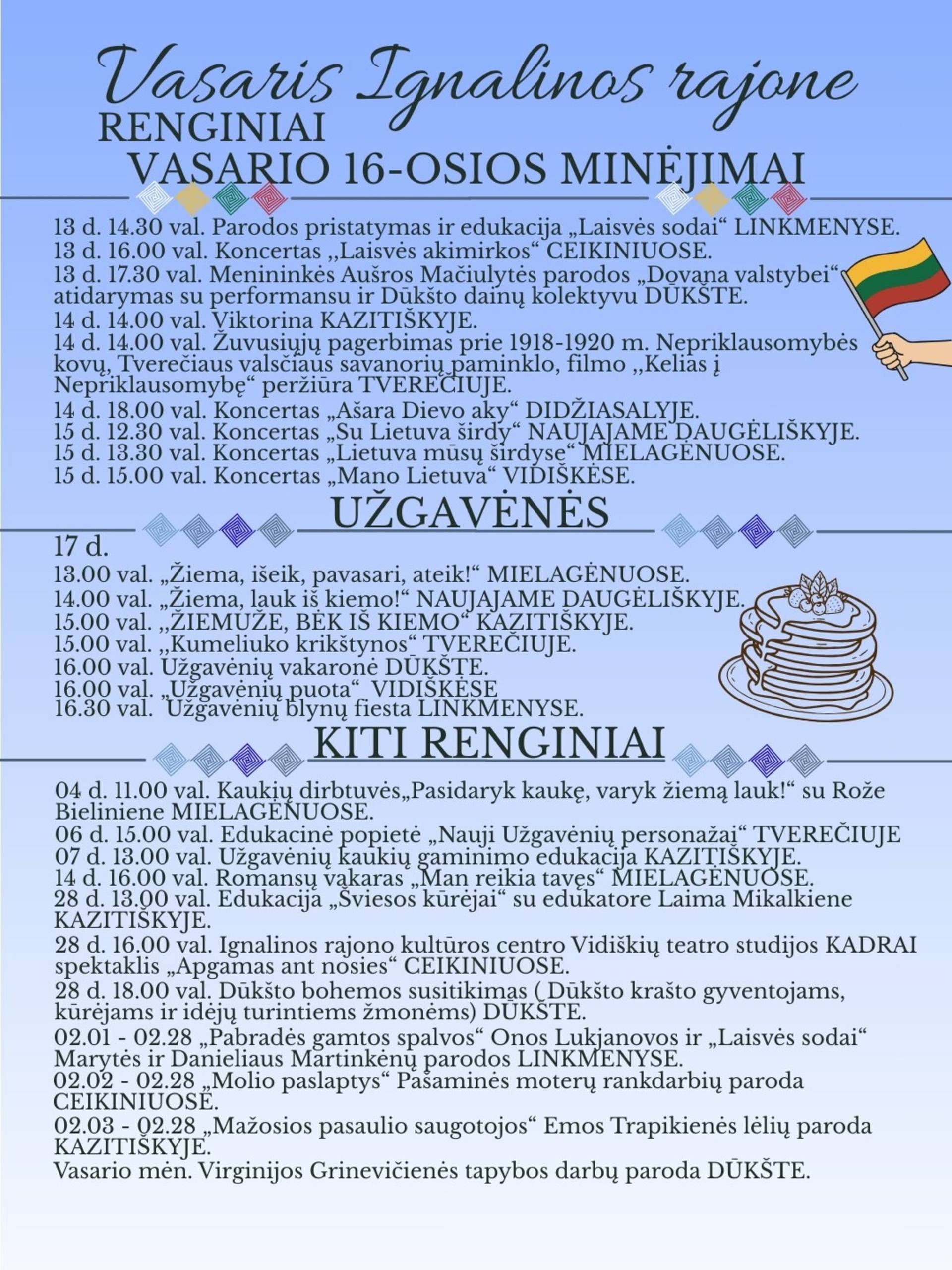 Vasario mėnuo Ignalinos rajone bus kupinas minėjimų, Užgavėnių švenčių, įvairių edukacijų ir parodų! Kviečiame keliauti po rajoną ir mėgautis renginiais! 🫶🤩