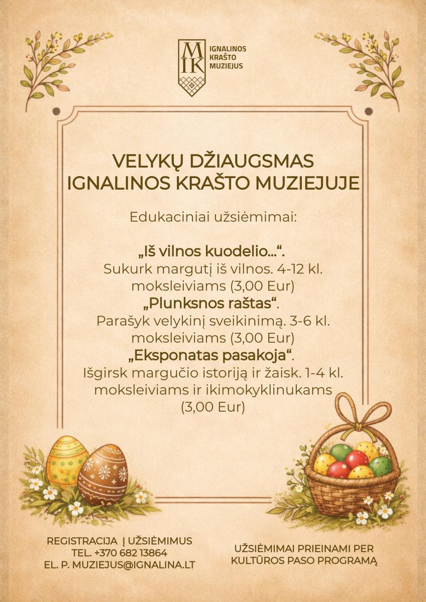 Maloniai kviečiame dalyvauti Ignalinos krašto muziejaus edukaciniuose užsiėmimuose „Velykų džiaugsmas“, kurių metu mokiniai susipažins su Velykų tradicijomis, papročiais ir simbolika, dalyvaus kūrybinėse veiklose bei patirs tikrą šventinę nuotaiką! ![]()