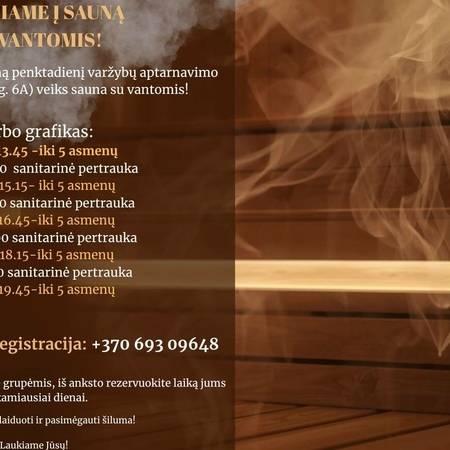 Приглашаем вас посетить сауну с деревянной обшивкой стен, которая открыта каждую пятницу в комплексе спортивного обслуживания по адресу: Sporto 6A, Игналина. Это отличное место для отдыха после рабочей недели, восстановления сил и наслаждения истинными прелестями сауны.